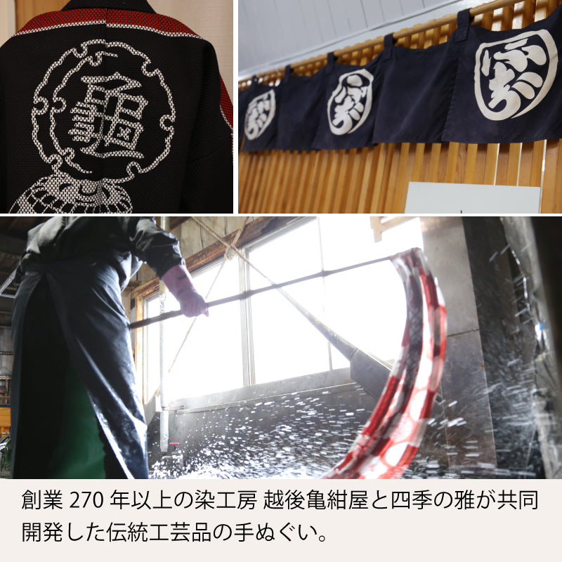 「四季の雅」ならではの世界観を、日本の知恵が詰まった手ぬぐいにのせてお届けするために、今回訪れた染工房は「越後亀紺屋」。新潟県にある、伝統工芸手ぬぐいの製造工房です。