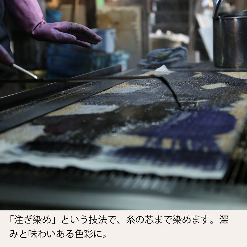 丹念に色を注ぐことで、糸の芯まで染み、表裏なく、ムラなく染め上がります。