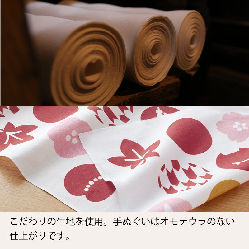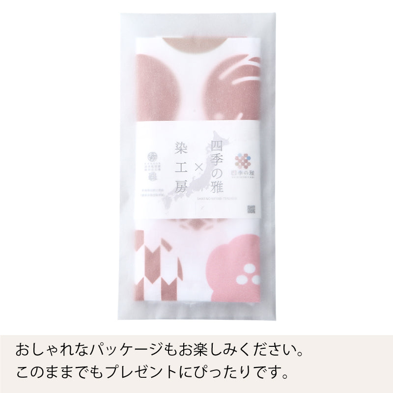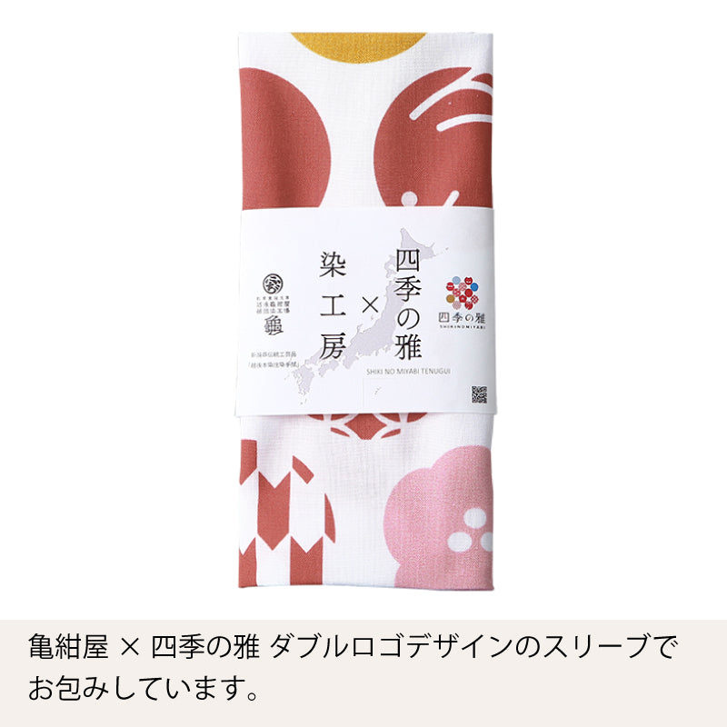 日本を象徴する朱赤、愛らしい桃色、きらびやかな黄金色の3色を色彩豊かに染め上げた手ぬぐいは、染工房 越後亀紺屋(えちごかめこんや)と四季の雅が共同開発した一品です。