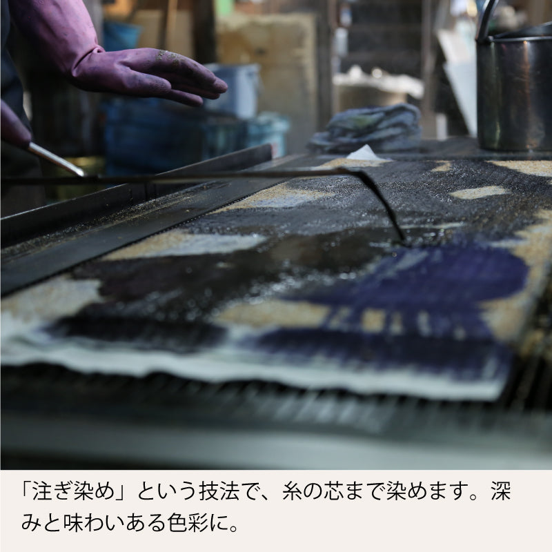 丹念に色をそそぐことで、糸の芯まで染み込み、裏までしっかりと染まります。